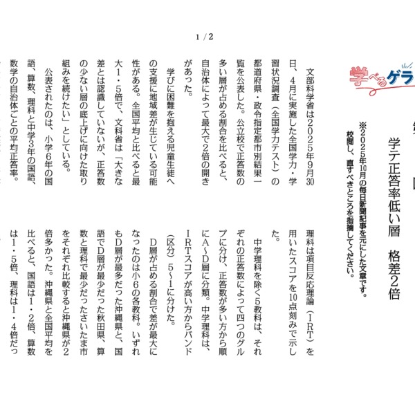 学べるゲラ第127回 学テ正答率低い層 格差2倍