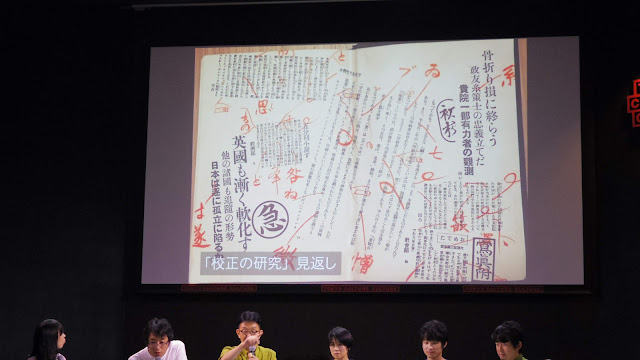 さて、本編に入り見坊さんが校正・校閲とはどんなものかを説明しました。書画カメラを使っての「実演」がうまくいき、後で出演者の間で「あれはよかったね。ほかでも使える」と高い評価。午前のリハーサルの際、「国語辞辞」の文字を直すところで前の方の「辞」の文字から鉛筆で引っ張って「書」と書き、「国語書辞」にしそうになっていました。そのときは笑って「いかんいかん」というだけだったのですが、本番でも前の方の「辞」を○で囲ってしまって「あらら?」。