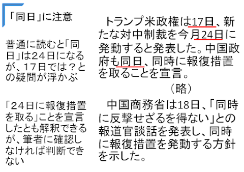 「米政権は17日、新たな対中制裁を今月24日に発動すると発表した。中国政府も同日、報復措置を取ることを宣言」とあった場合、校閲記者はまず「中国政府が宣言した『同日』というのは、17日ではないか?」と疑います。