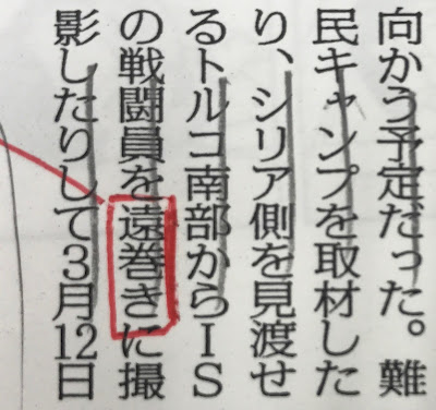 紛争地を訪れようとしたカメラマン。記事は、国境付近の戦闘員を「遠巻きに撮影したり」する計画を立てていたと説明しますが、「遠巻きに」は遠くから取り囲む様子を言います。1人だけでは遠巻きになりません。遠くから眺めるという意味で「遠目に」としました。