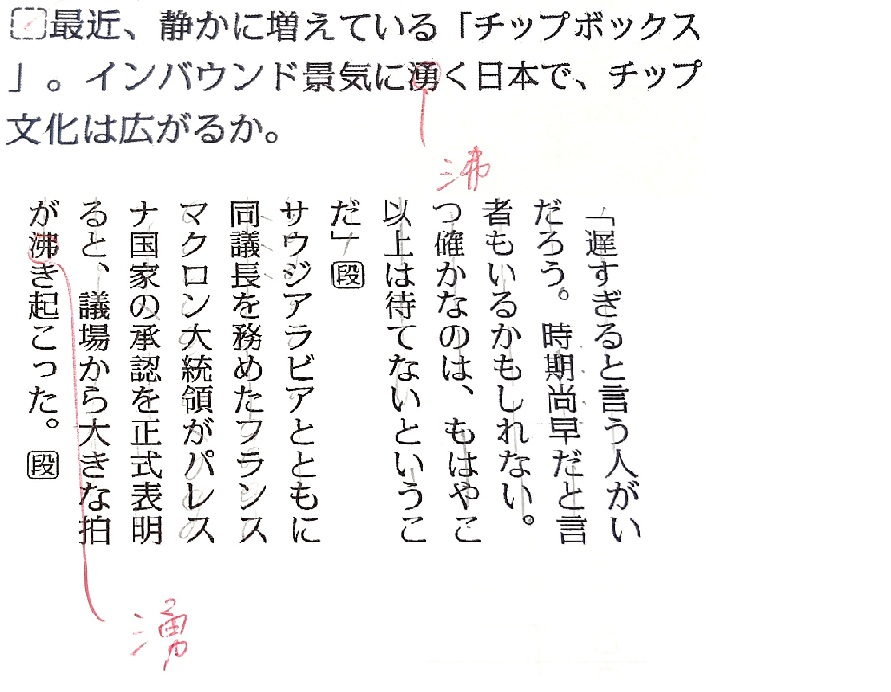 2日続けて直しを入れました。「インバウンド景気に湧く日本」は「感情が高ぶる。興奮する」(明鏡国語辞典)という意味の「沸」の字に。翌日の「大きな拍手が沸き起こった」は「ある物事が盛んに起こる。また、ある現象が生じる」(同)という意味の「湧」に直しました。