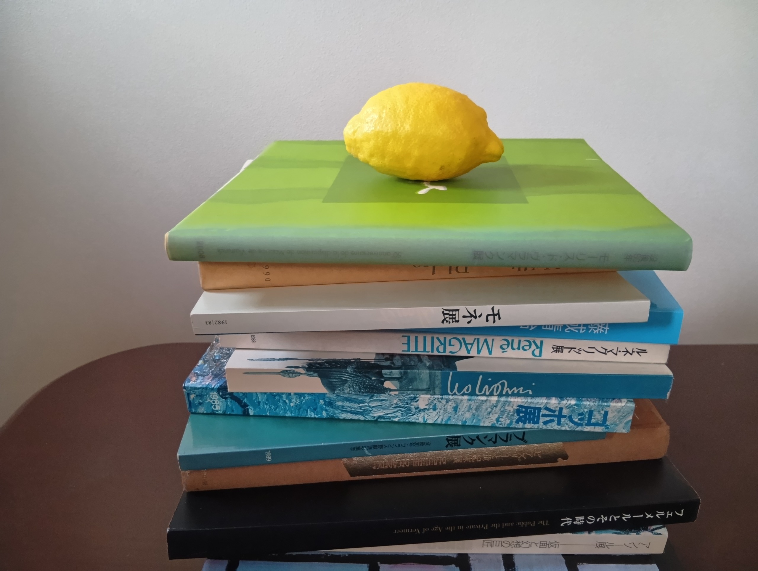 「あ、そうだそうだ」その時私は袂(たもと)の中の檸檬を憶(おも)い出した。本の色彩をゴチャゴチャに積みあげて、一度この檸檬で試して見たら。「そうだ」