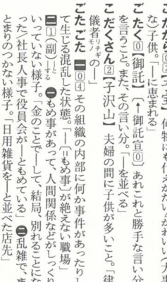 「御託宣」の後に「ごたごた」。水野さんは「ご託宣をごたごた言うなと言われたら、集英社国語辞典第3版623ページかよ!と言いましょう!」と言うのですが、これも新明解国語辞典では「御託」の項目に「〔←御託宣〕」とあって「御託宣」の項目は立っておらず、しかも「ごたごた」との間に「子沢山」が挟まっているので物語(?)の生まれようがないのでした。