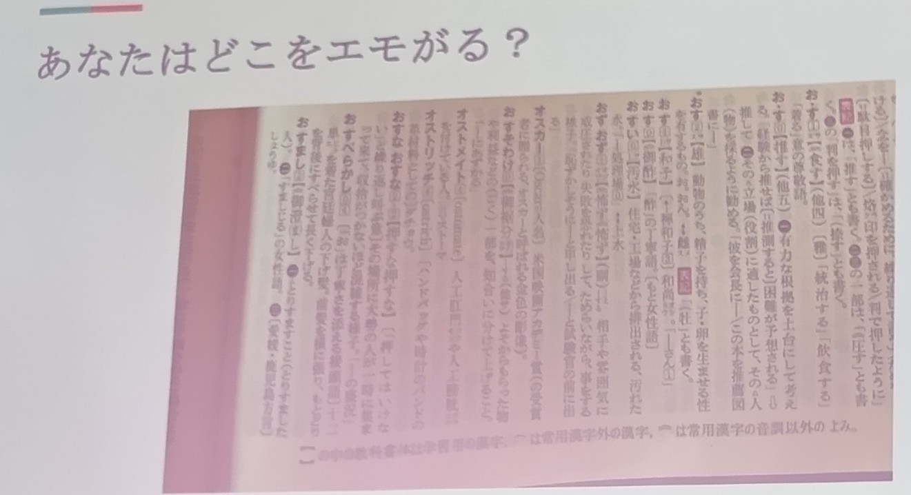 水野さんが「エモがる」(「エモい」=「心がゆさぶられる感じだ」三省堂国語辞典)のは、日常の言語生活で使う言葉はそれぞれ限られていて偏っているものだけれど、辞書は50音順に無理やり並べられていることから起こるといいます。「デスゲーム」のように全く関係のない日本国民が集められて無理に並べられたときに、たまたま前の人が中学時代の同級生だった……!といったことが辞書で味わえるというのです。
