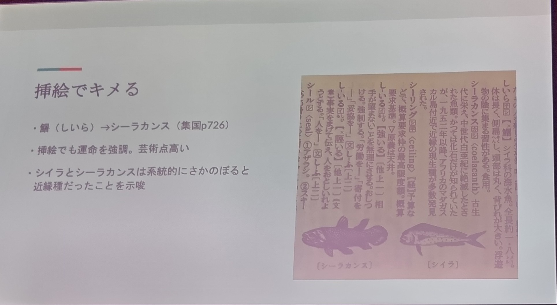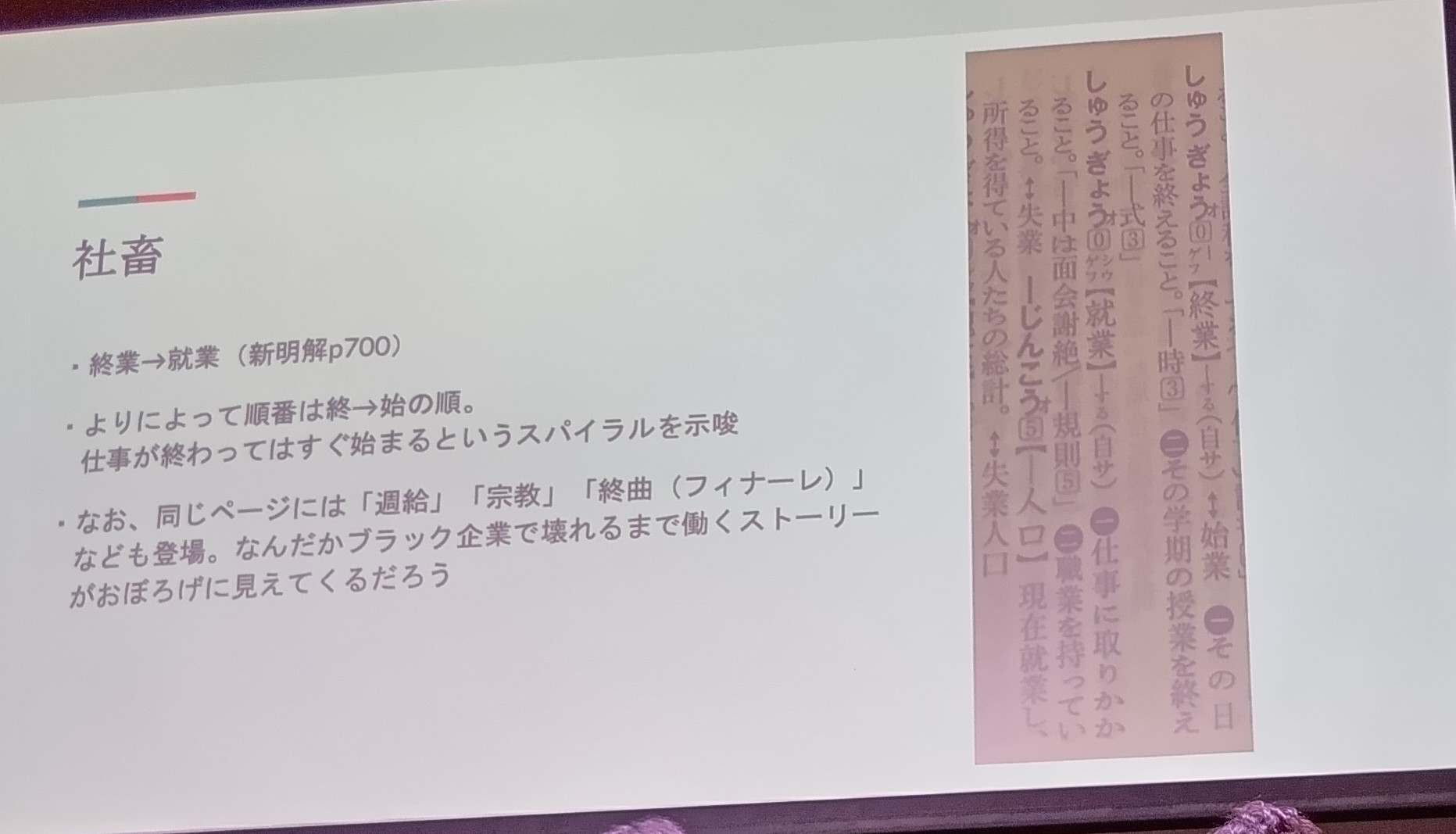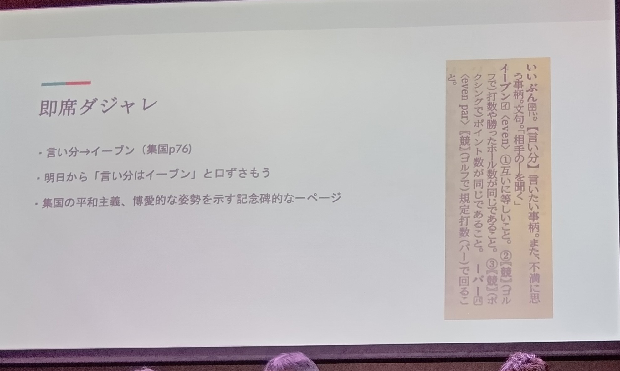 なかなか面白い例が見つかるものだな、辞書を通読してみようかと思わせられた(できゃしないけど)プレゼンでした。