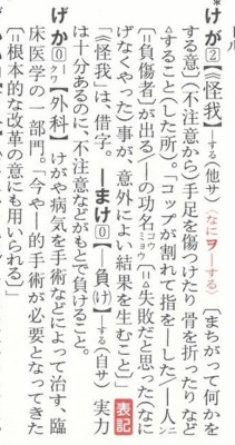 「けが」のあとに「外科」がくる。語源的にも全く関係のない2語ですが、「外科」の語釈の中に「けがや病気を……」と「けが」が出てくるのです。