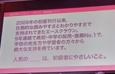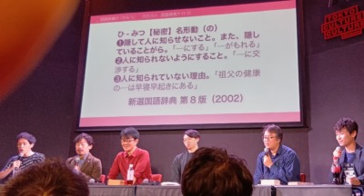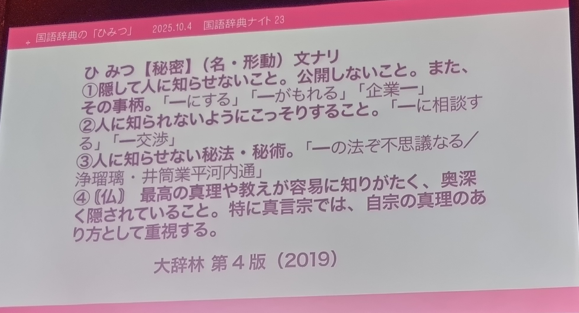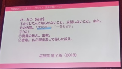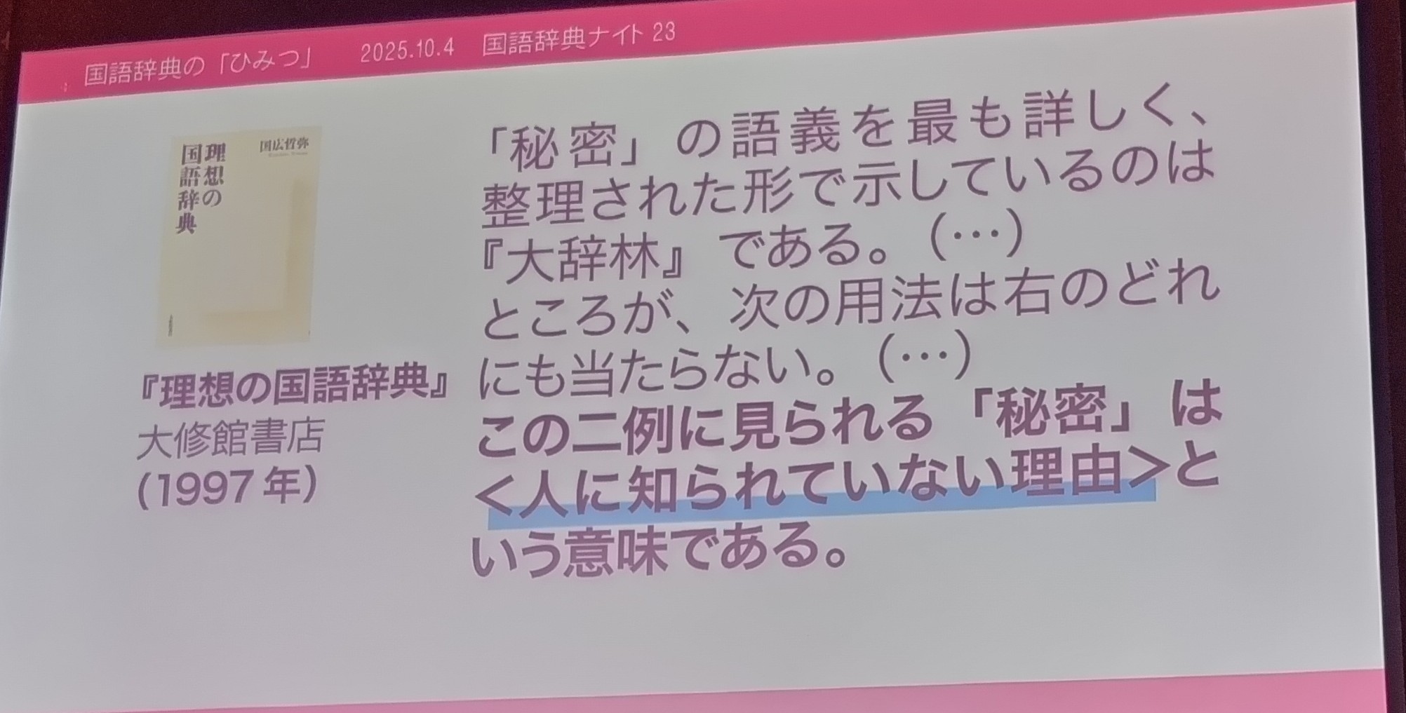 新選国語辞典は94年の7版にはなかった「人に知られていない理由」という語釈を2002年の8版で加えていたのです。会場どよめく。