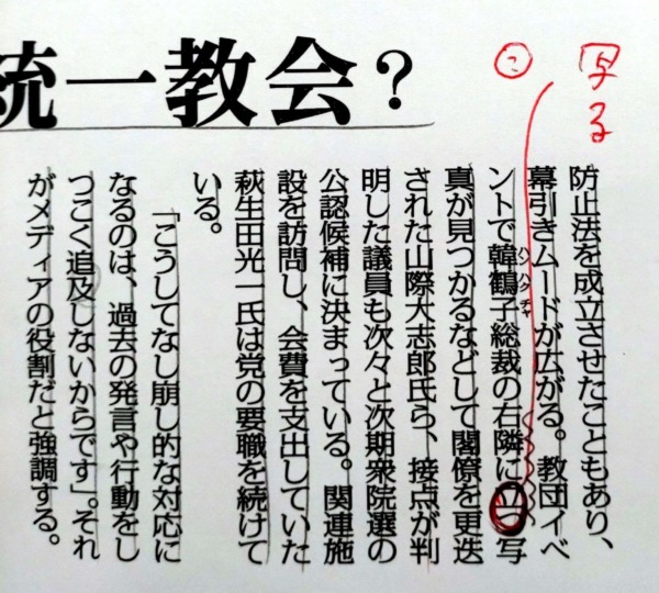 「右隣に立つ写真」――該当する写真を見てみると、左から韓鶴子氏、山際大志郎氏の順でカメラの方を向いて並んでいました。しかしその場合、実際に山際氏が立っている場所は韓氏の「左隣」なのでは? 「右隣に写る写真」と直しました。