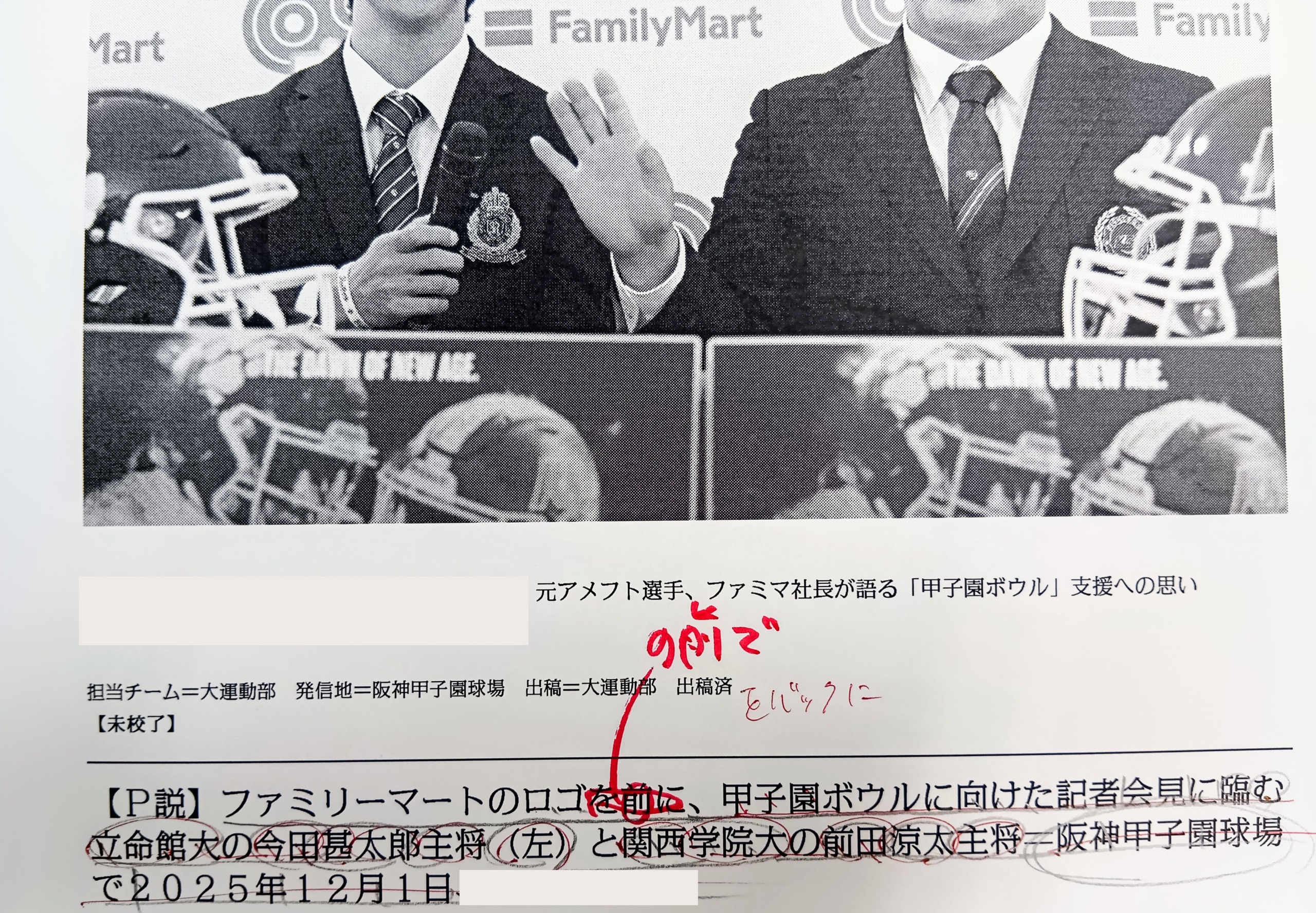 この写真説明にもある「立命館大の今田甚太郎主将(左)」のように位置を記号的に示す場合は読者視点で考えますが、「ロゴを前に会見」のように文章で位置関係を説明しようとする場合は、写っている対象の視点を想像してみる必要があります。今回の例であれば「ロゴをバックに」「ロゴを背に」などの書き換えも可能ですね。