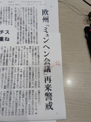 本文ではきちんと「ミュンヘン会談」となっていたのに、見出しでは「会議」に。字の形も似ているので見逃しそうになりましたが、やはり日本語では「ミュンヘン会談」が一般的です。