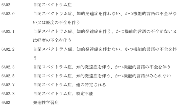 「自閉スペクトラム症、知的発達症を伴う、かつ機能的言語がみられない」などという分類があり、「知的発達症」が繰り返されています。