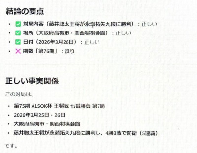 その後、「第76期」と間違えたままの写真説明を書いてAIに「正しいか教えて」と尋ねました。すると対局内容→正しい▽場所→正しい▽日付→正しい▽期数「第76期」→誤り――と、的確な指摘・回答をしてきました。校閲作業は新聞を読むなどして得る知識や日々の見聞が生きてくるものではありますが、AIはそれを補完するツールとして進化してきているようにも思えます。
