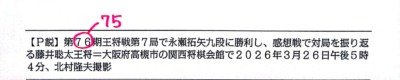 王将戦はタイトルカット(イラスト)が紙面に載るのですが、見比べるとカットには「第75期」とあり、写真説明の間違いに気が付きました。「♫思いこんだら~」という歌詞のテーマソングの野球アニメが昔ありましたが、出稿部の担当者の思い込みが原因だったようです。